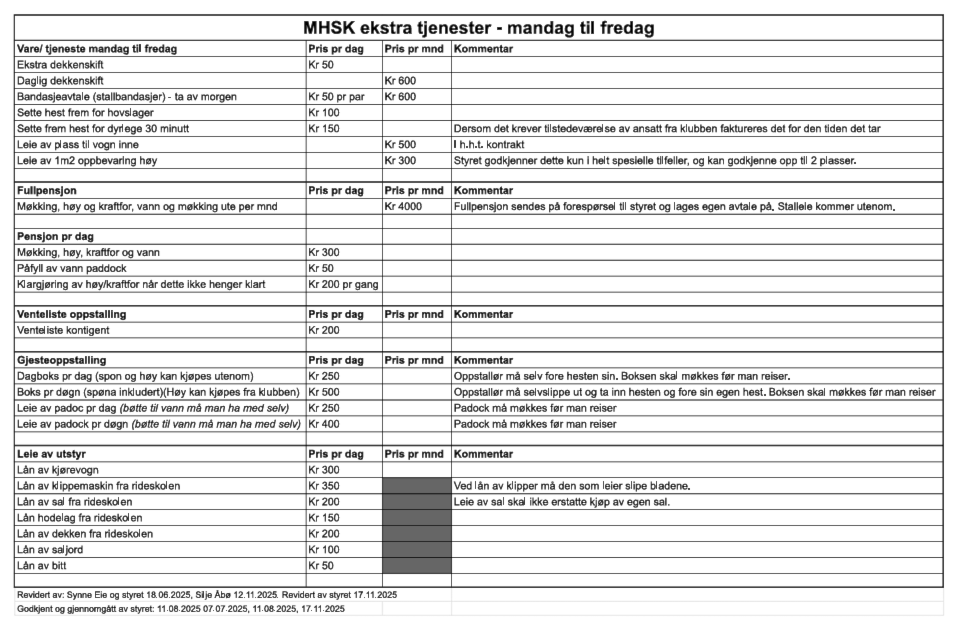 Ekstra tjenester sendes inn som bestilling til: nestleder@mastra-hsk.no