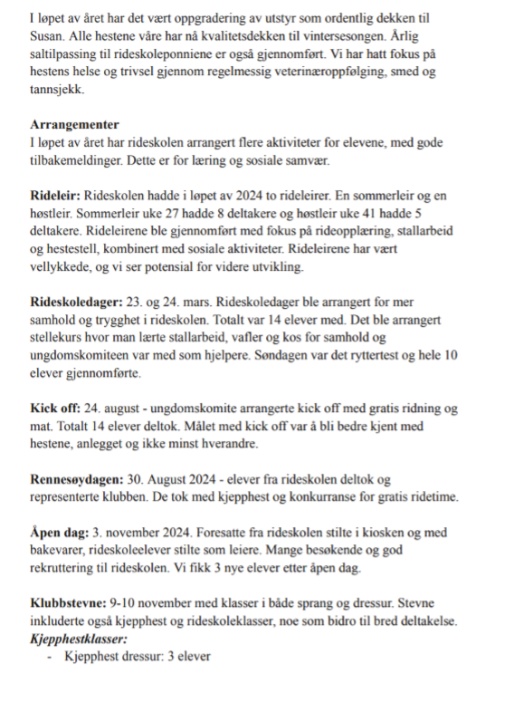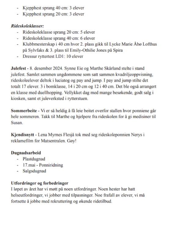 Klubben fortsetter med rekruttering og har i 2024 arrangert rideskole 3 dager i uken. Synne Eie er instruktør i rideskolen. Flere av våre nye ryttere har også fullført grønt kort. Vi gleder oss til enda flere stevnedeltakere!